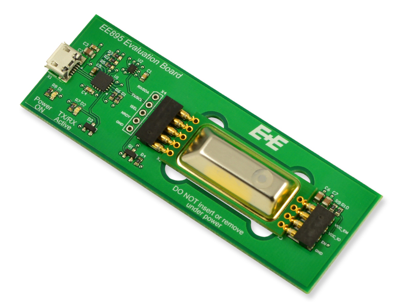 С помощью оценочной платы (заказывается отдельно) модуль EE895 можно протестировать на ПК. Бесплатное ПО для оценки отображает данные измерений в графической форме и позволяет пользователю устанавливать частоту дискретизации и единицы измерения температуры и давления. Для дальнейшей обработки данные можно сохранить в файле формата .CSV.